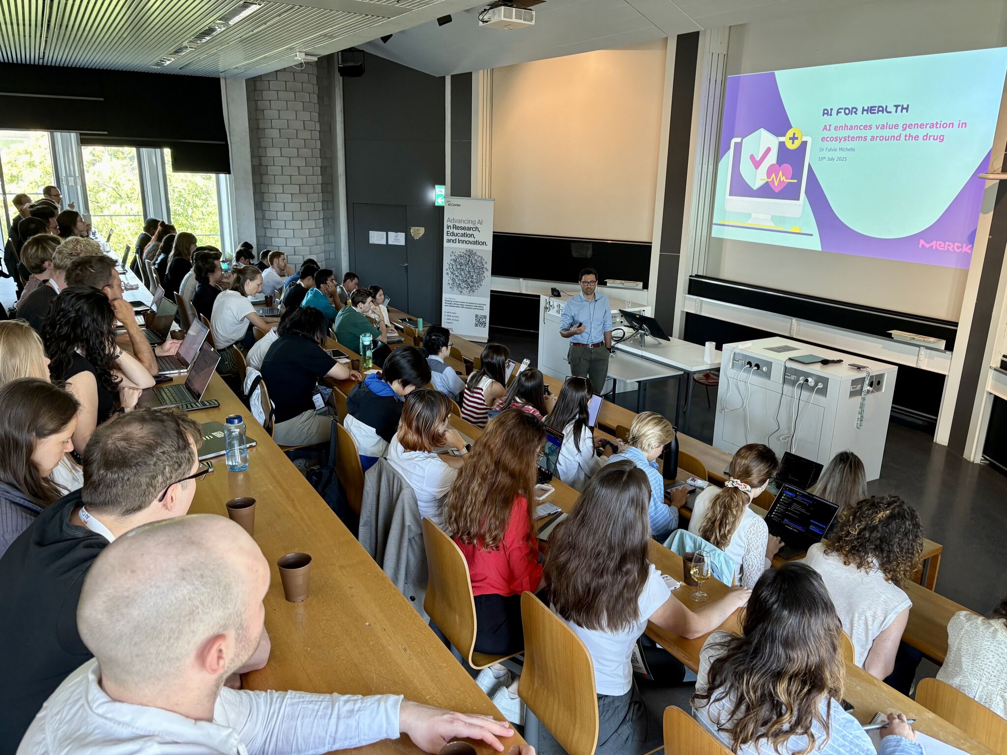 (Dr. Fulvio Michelis (Merck Group) giving his presentation on “AI enhances value generation in ecosystems around the drug”)