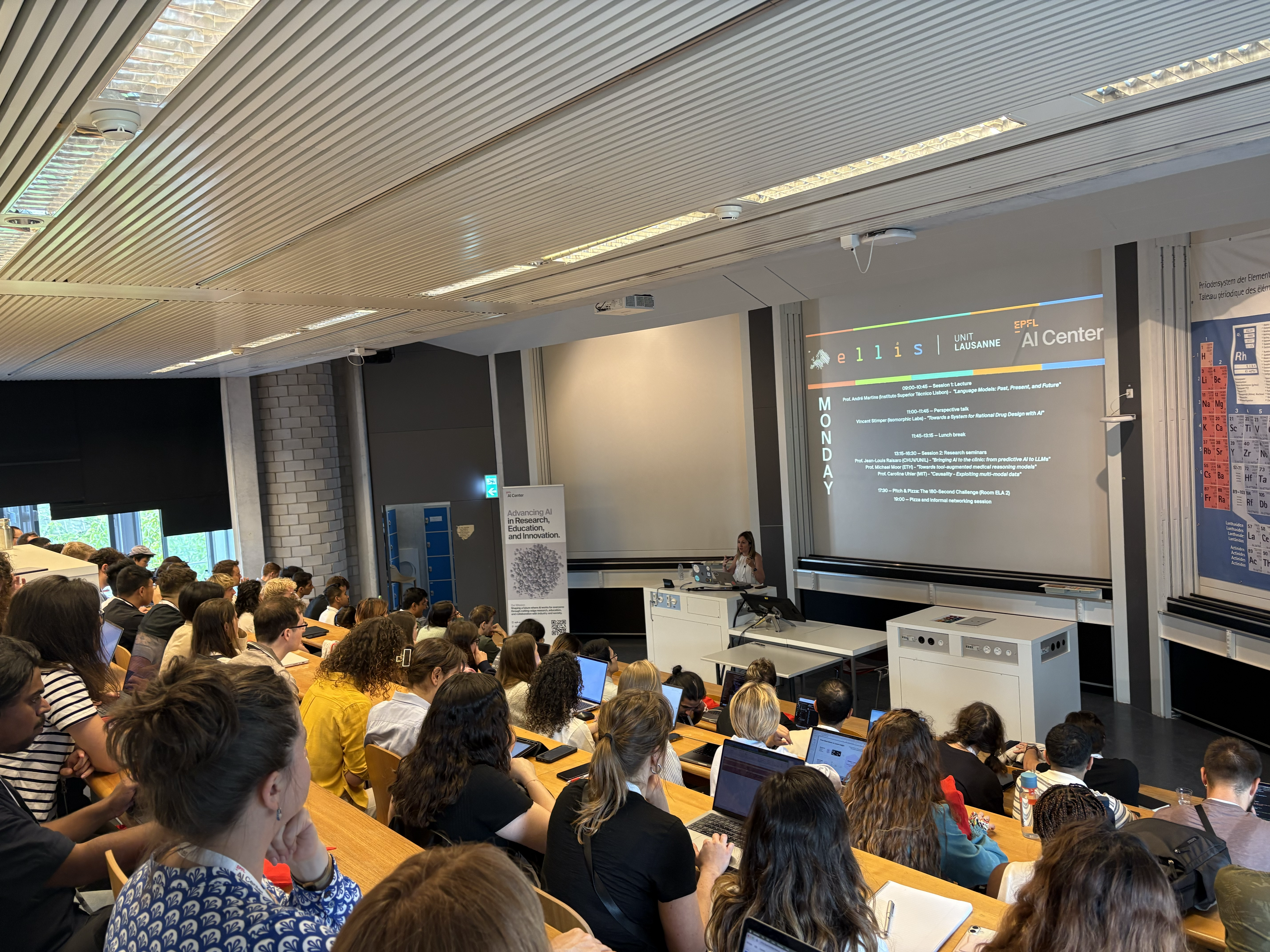 The summer school, jointly organised by ELLIS Unit Lausanne and the EPFL AI Center, brought together around 70 Master’s and PhD students to explore a range of topics in AI for health. The programme included lectures by well-known researchers and practitioners from diverse backgrounds, addressing both current developments and practical challenges in applying AI to biomedicine, while also offering opportunities to revisit foundational concepts and explore recent advances in AI. A hands-on workshop gave the students the opportunity to explore advanced LLMs applications and multi-agent systems.