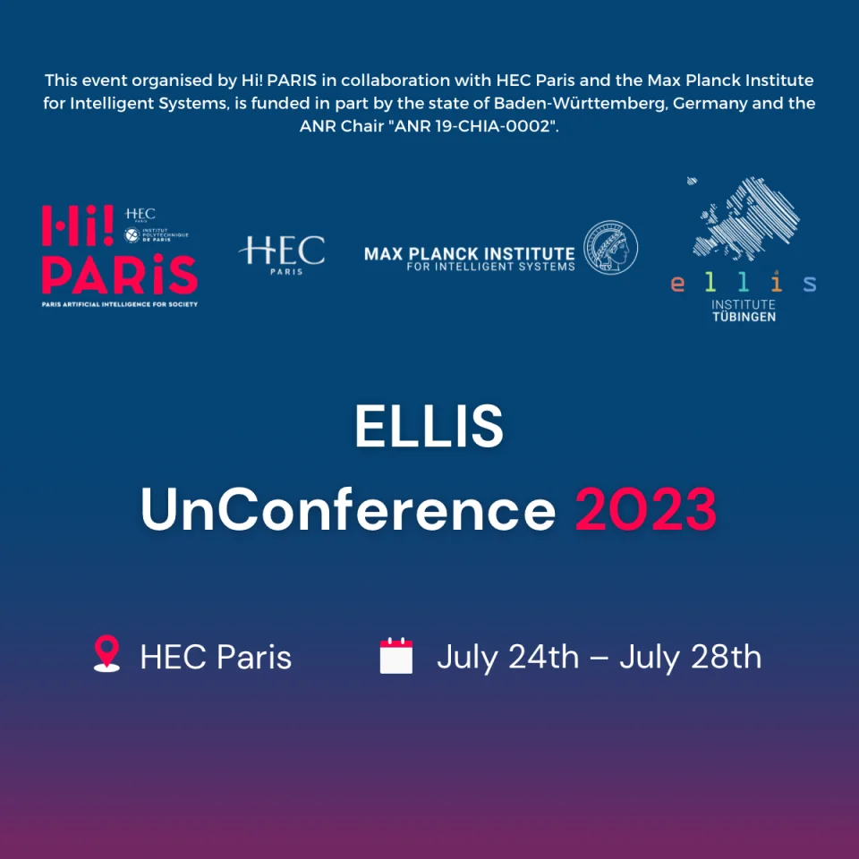 The ELLIS UnConference was organized by Hi! PARIS in collaboration with HEC Paris, the ELLIS Institute Tübingen and the Max Planck Institute for Intelligent Systems. It was funded in part by the state of Baden-Württemberg, Germany, and the ANR SCAI Chair “ANR 19-CHIA-0002”. The UnConference was the second of its kind, inviting participants to create the agenda themselves by suggesting topics and times for workshops, keynote talks and discussion sessions.